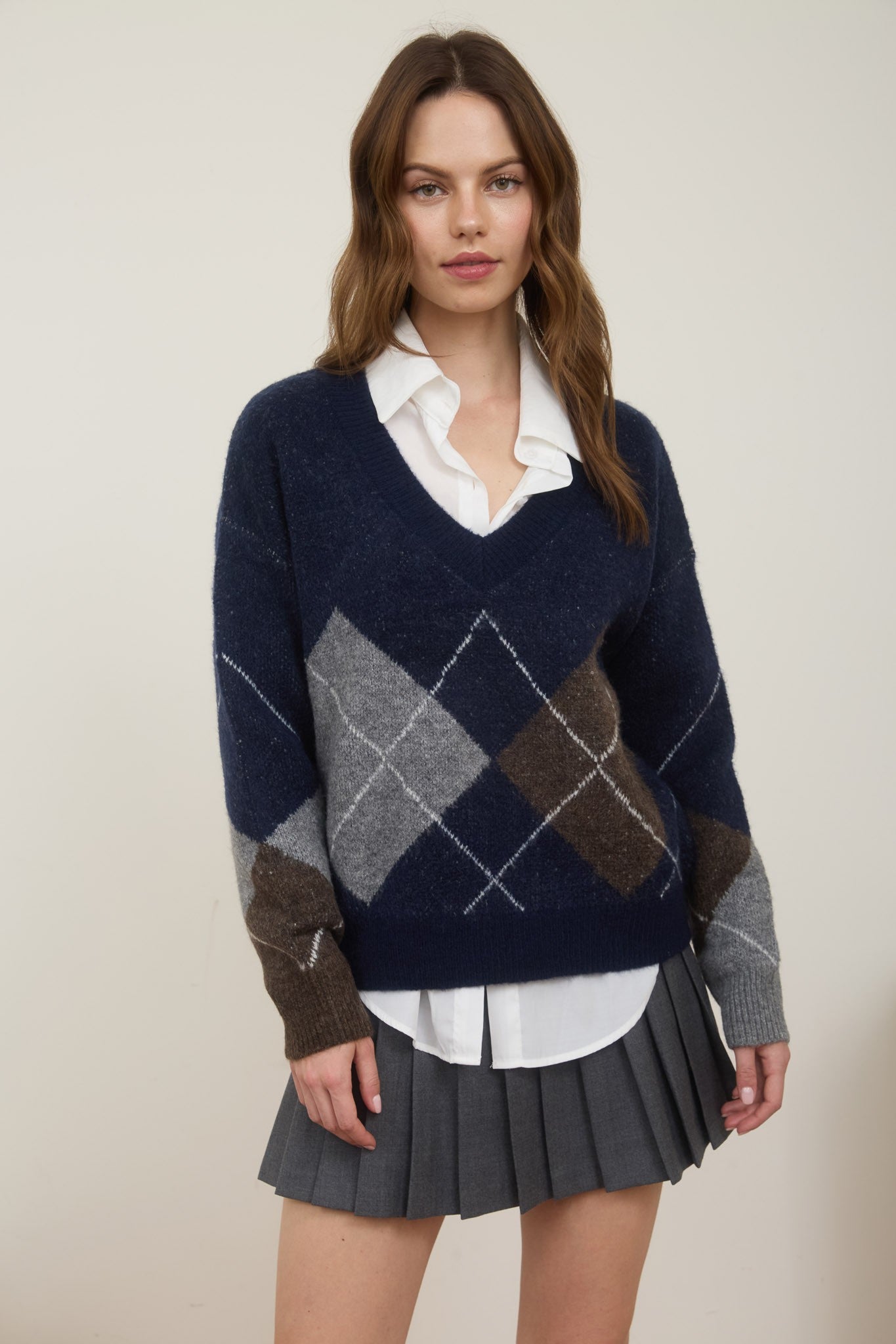 A timeless V-neck knit with a bold argyle pattern, blending classic prep with effortless cool. Designed in deep, versatile tones, this sweater layers easily over crisp shirts or pairs solo for a modern, collegiate edge.