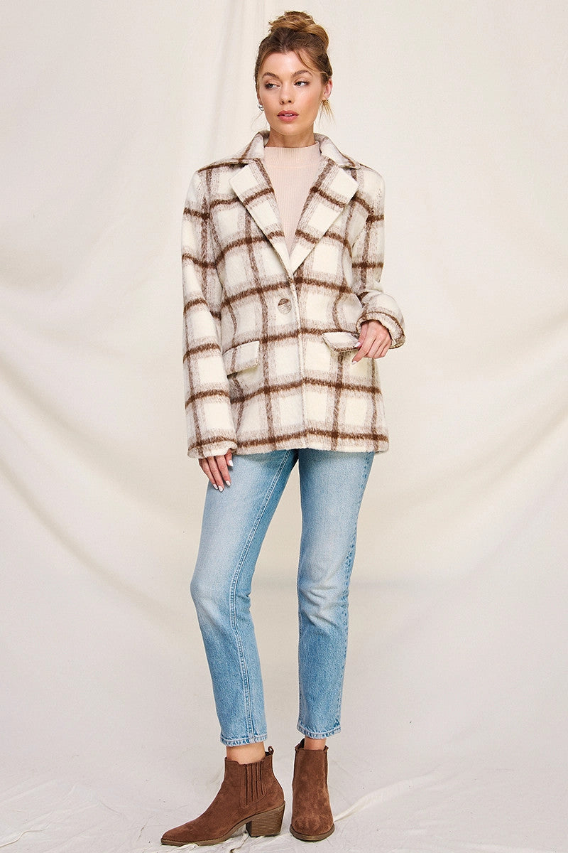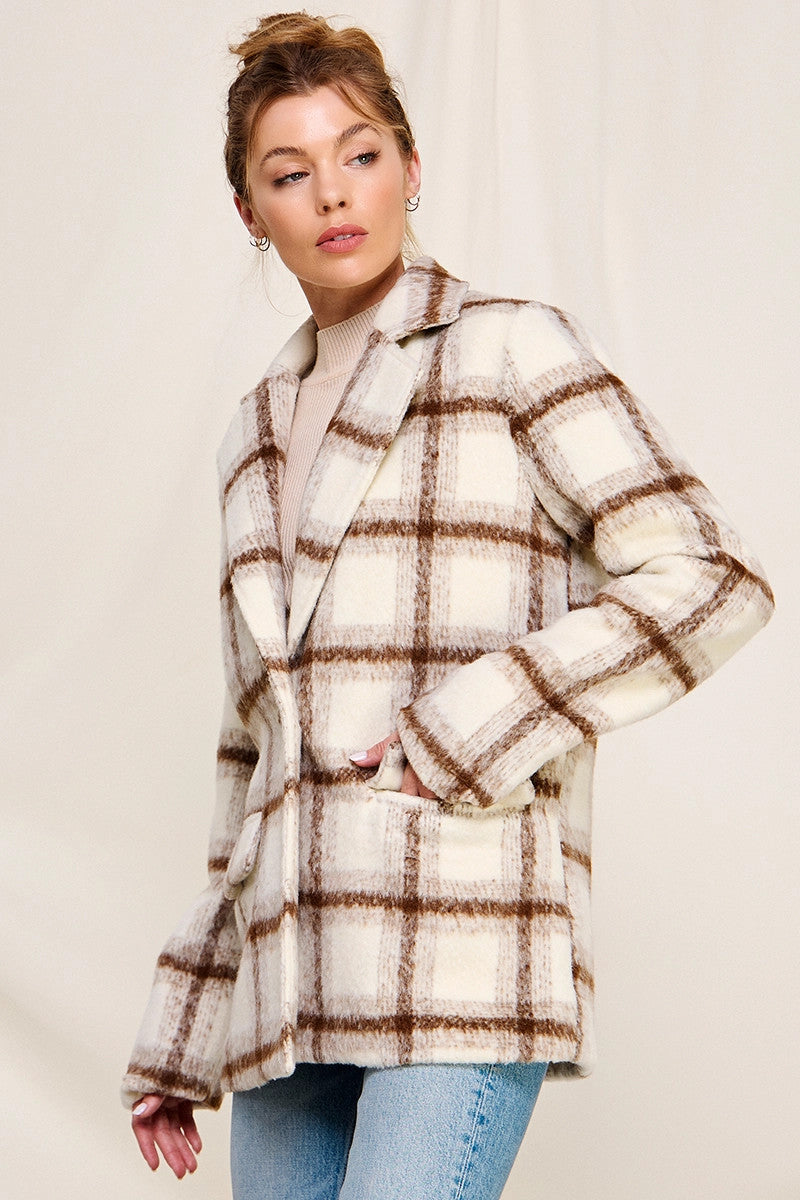 A modern plaid rendered in soft texture and muted tones. This easy, unstructured coat layers cleanly over knits and denim, striking a balance between polish and ease.
