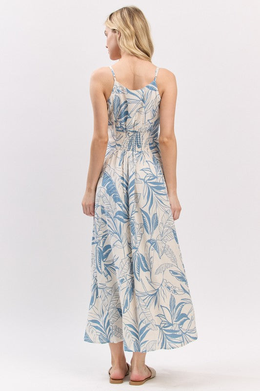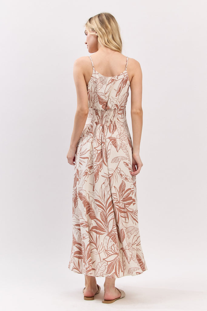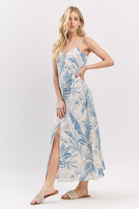 Breezy and effortless, this tropical leaf print maxi dress has adjustable straps, a chic fabric button-down front, and a front slit.