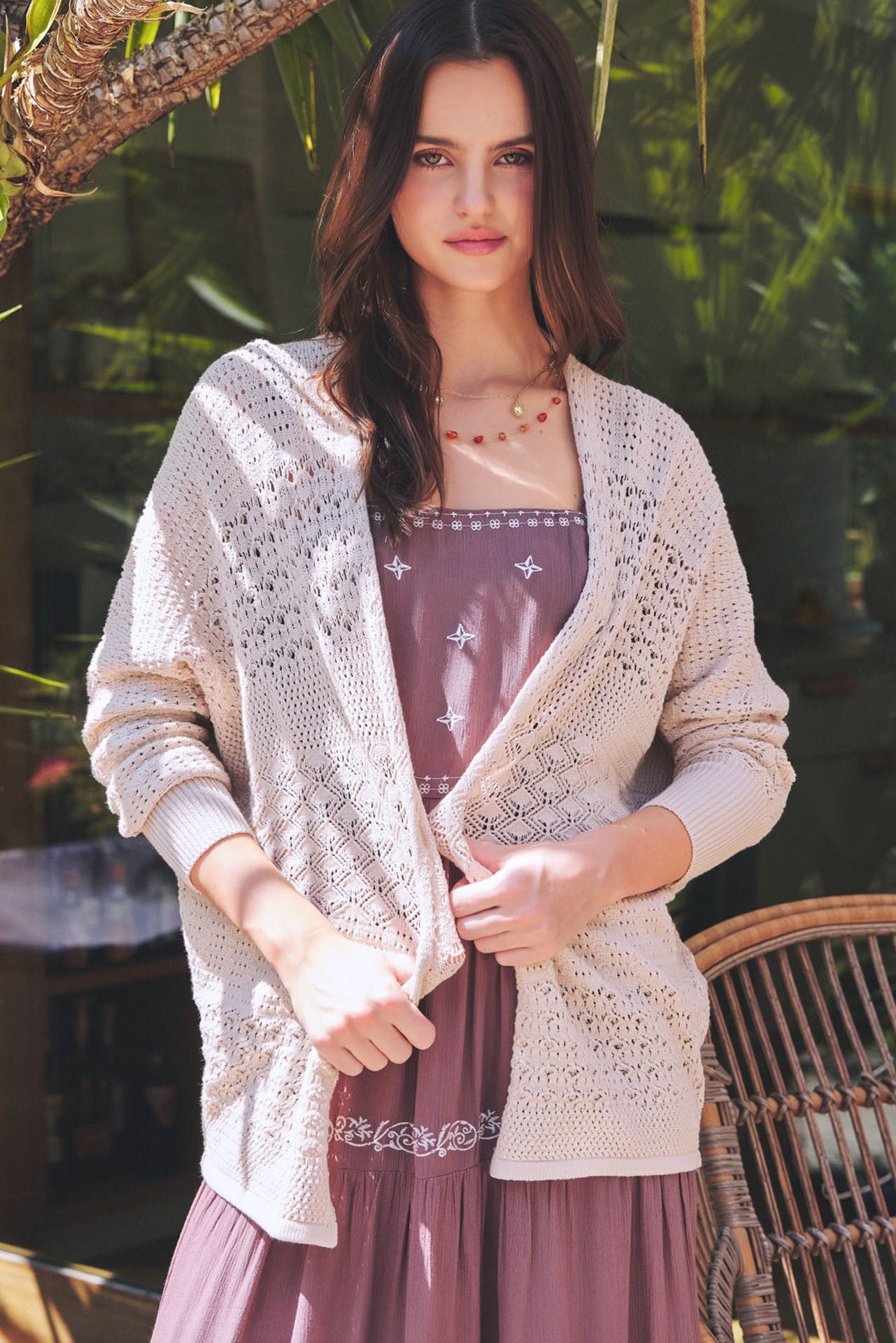 The "Spring Whisper Cardigan" offers a delicate layer of warmth with its open crochet knit and airy design. Featuring comfortable 3/4 dolman sleeves, this cardigan is perfect for adding a touch of bohemian elegance to your spring ensembles.