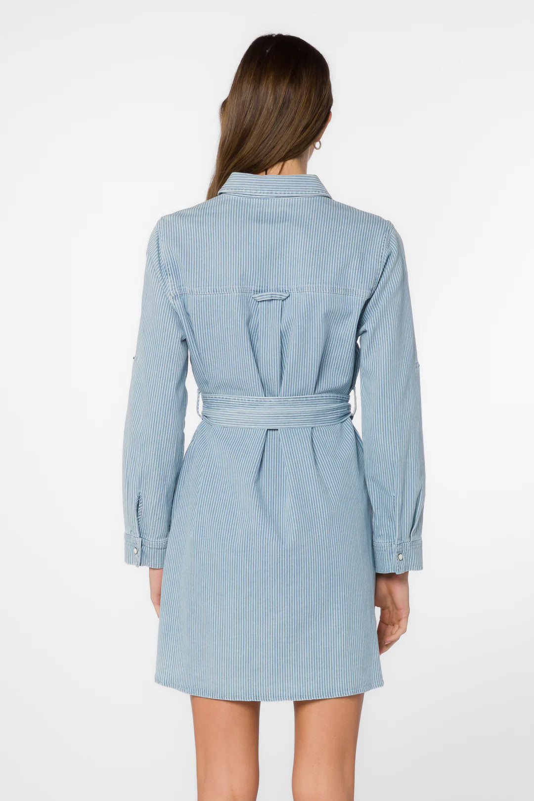 A relaxed striped shirt dress with an easy button-front silhouette and waist-defining tie. The rolled sleeves and soft, lightweight feel give it an effortless finish, while pockets add everyday ease. Perfect for warm days, travel, or casual plans.