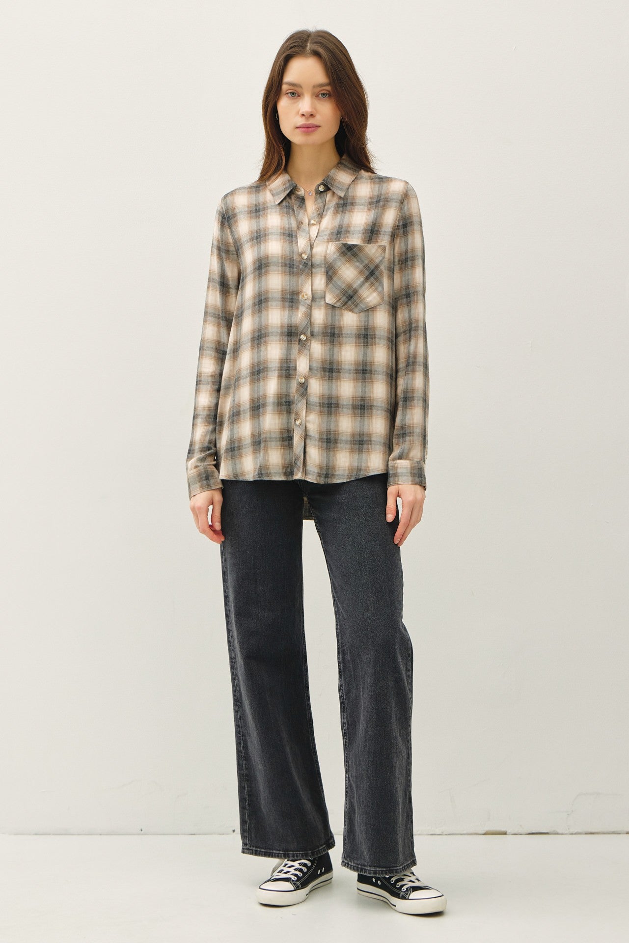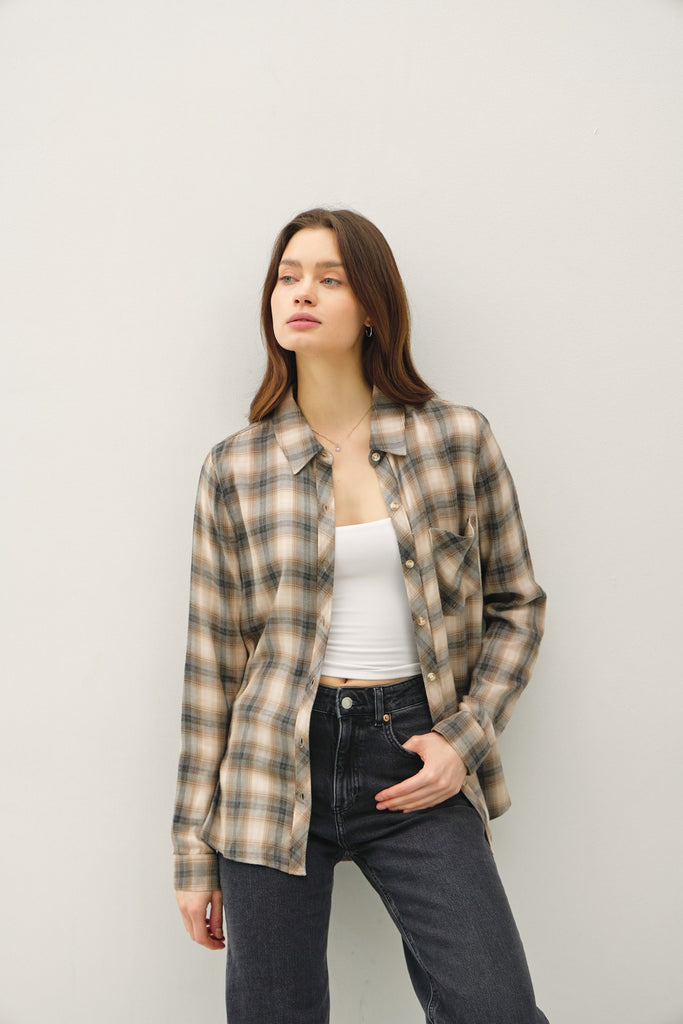 Laid-back and versatile, this neutral-toned plaid shirt is a wardrobe essential. Featuring a relaxed fit, chest pocket, and soft woven fabric, it’s perfect worn open over a tank, buttoned up with denim, or layered for cooler days.