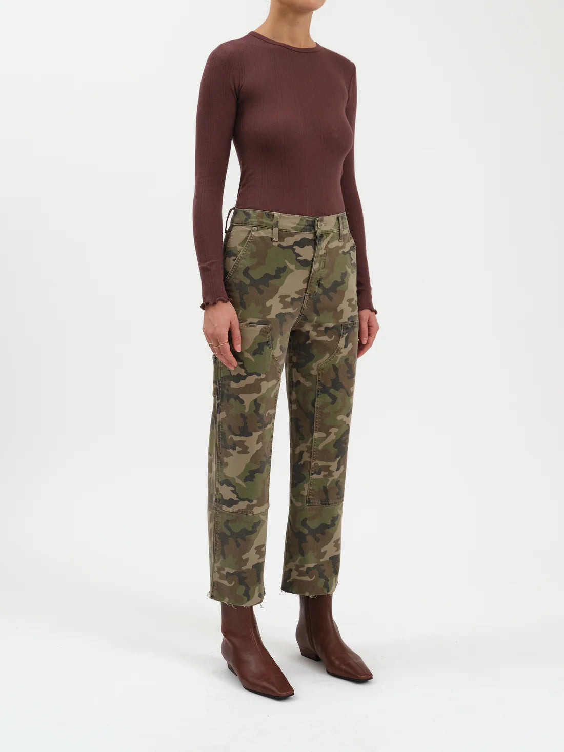 Utility-inspired and effortlessly cool, these camouflage denim pants blend rugged style with a modern, cropped silhouette. Featuring a straight leg, patch pockets, and raw hem detailing, they’re designed to add a laid-back edge to everyday outfits. Pair them with knits, structured tops, or boots for an off-duty look that feels elevated yet easy.