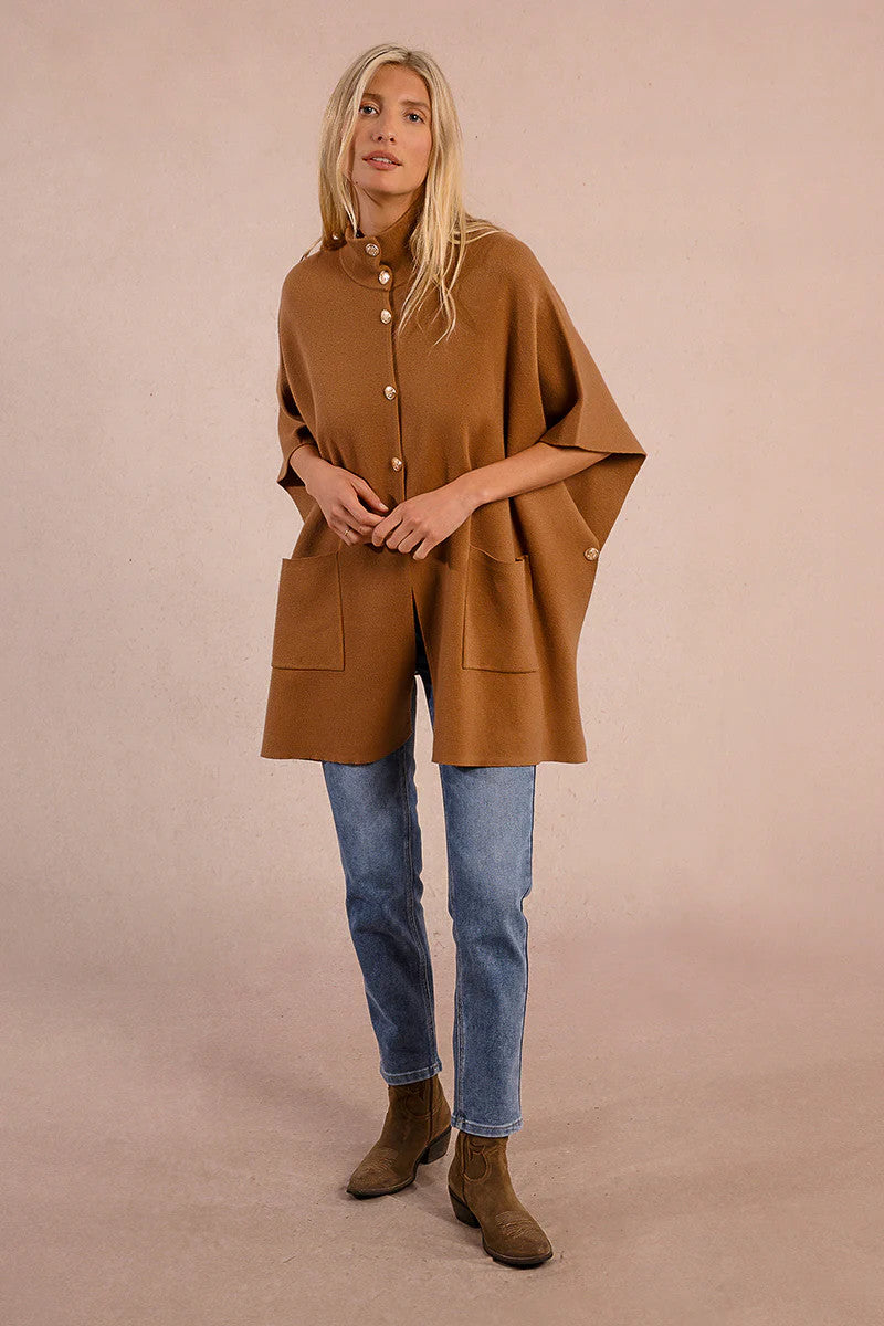 An elegant cape silhouette accented with gleaming buttons and roomy front pockets. Effortlessly chic, it layers beautifully over denim or tailored trousers for a polished finish.