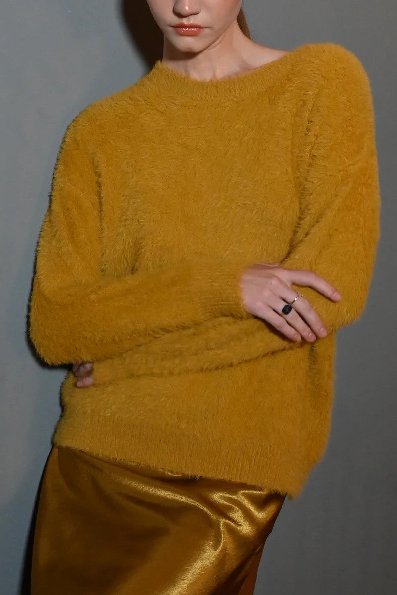 A plush, feather-soft knit with a relaxed silhouette and cozy texture. Designed for both comfort and impact, it’s the perfect sweater to dress up or down with ease.