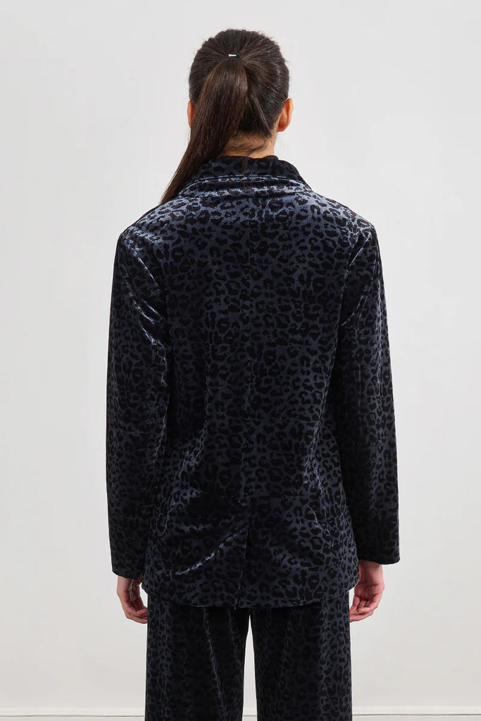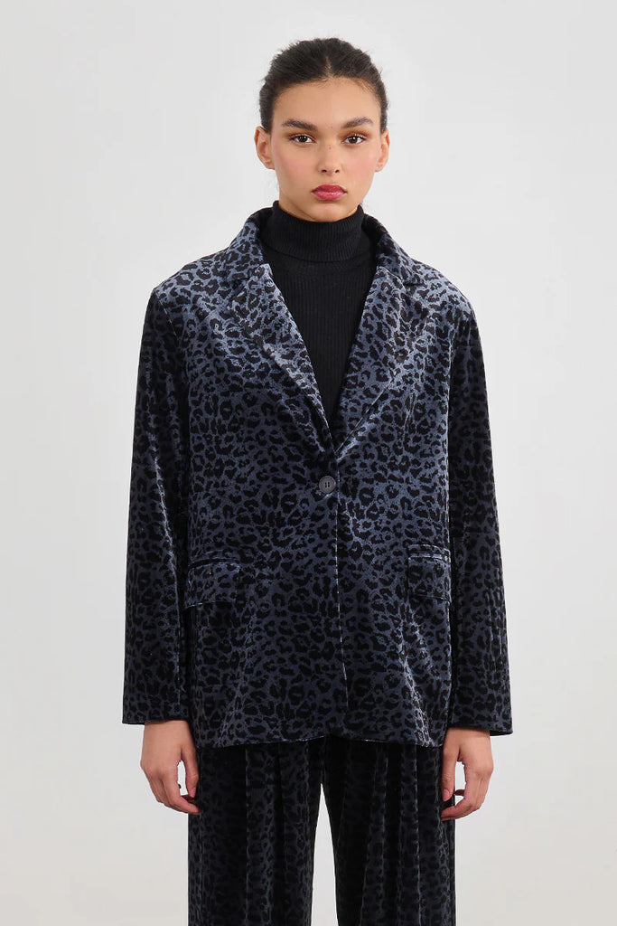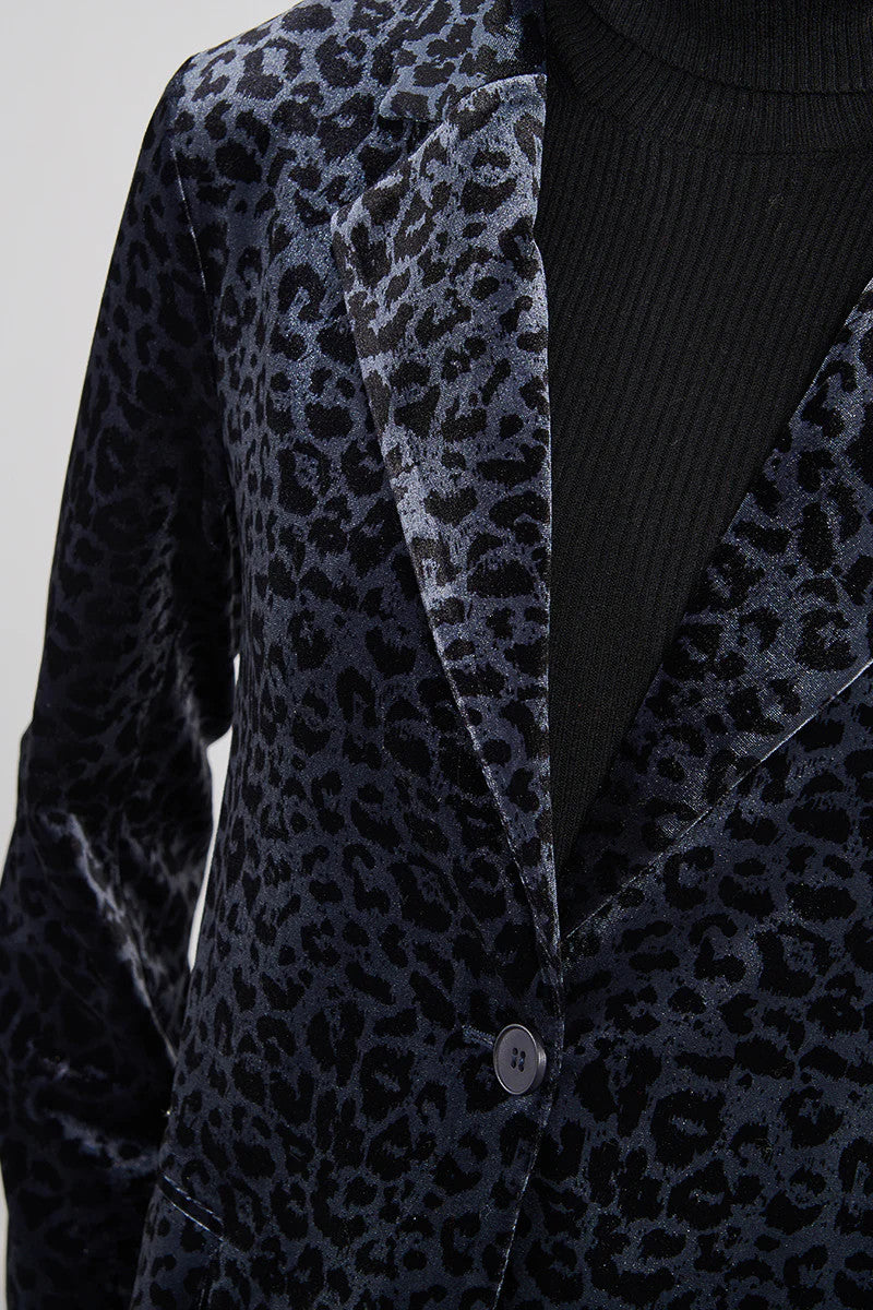 • Command attention in the Midnight Panther Blazer, a luxe velvet piece with a subtle animal jacquard finish. Its sleek single-button closure, soft tailoring, and tactile sheen make it the perfect blend of fierce and refined. Pair it with matching trousers for a daring set or style it over denim for elevated edge.