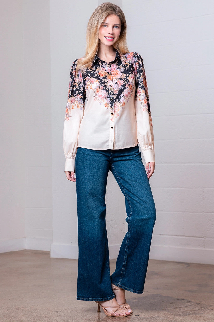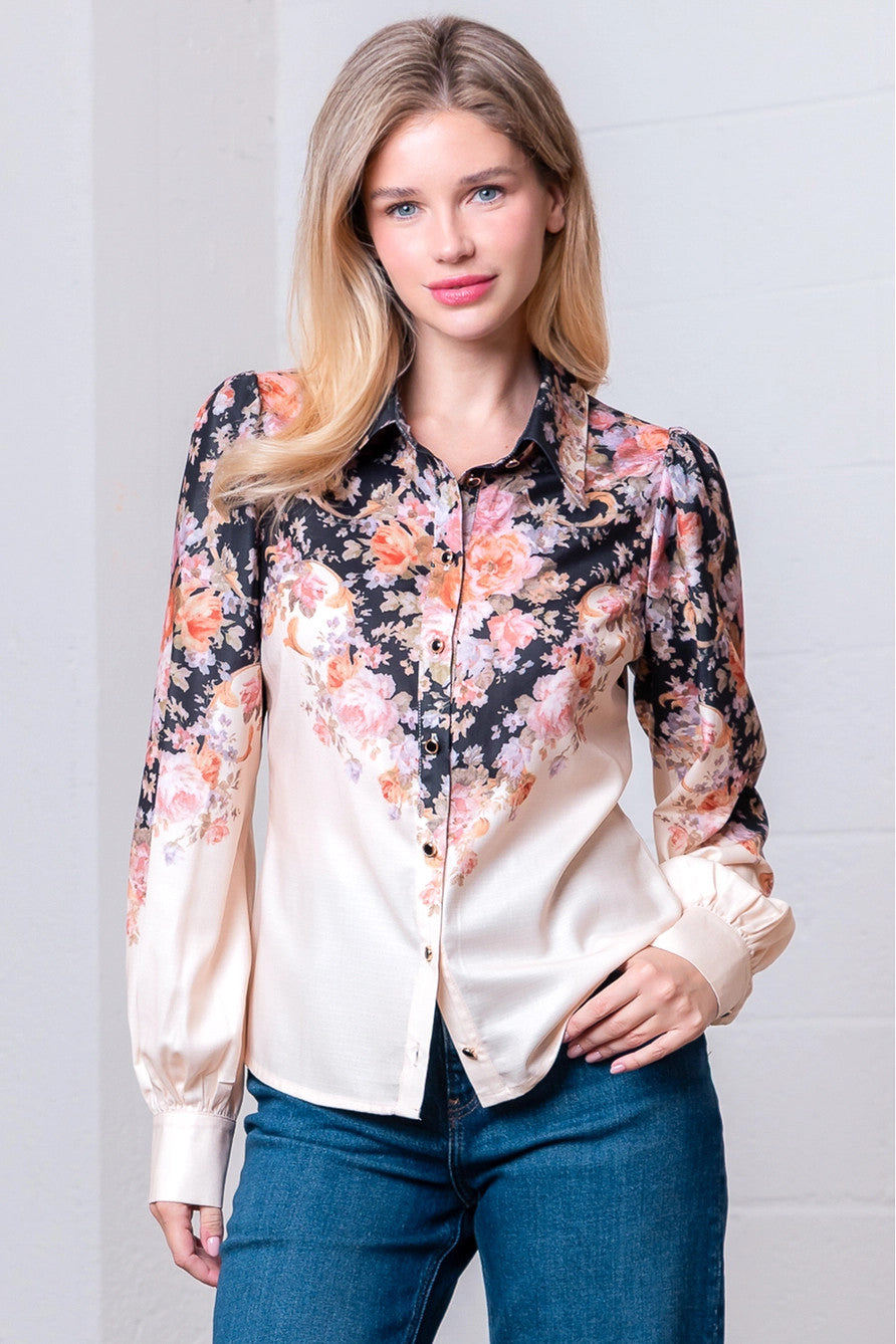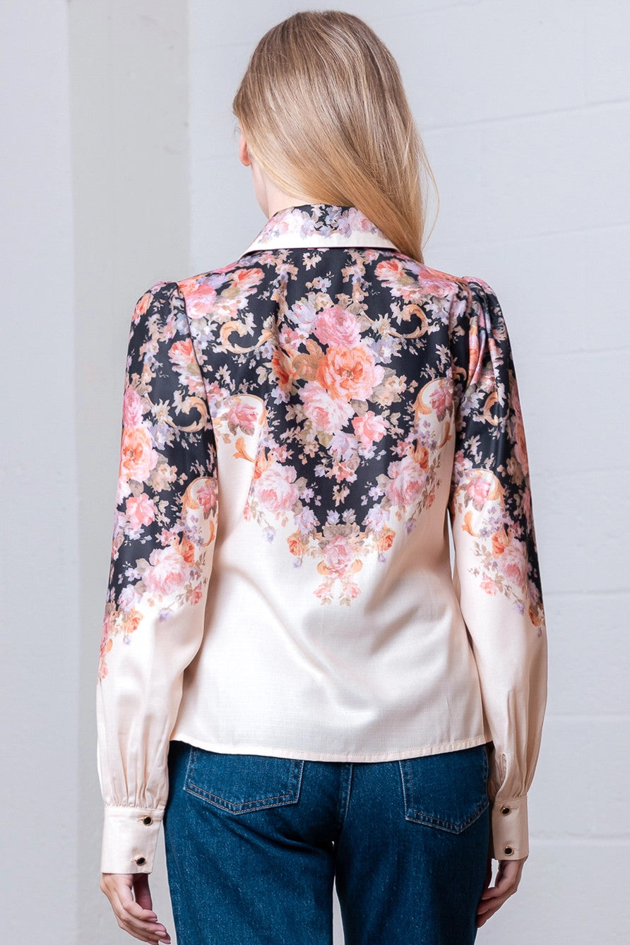 Romantic but polished. This blouse pairs soft florals with a silky drape that feels effortless against the skin. The darker floral yoke adds contrast while the blush body keeps it light and feminine