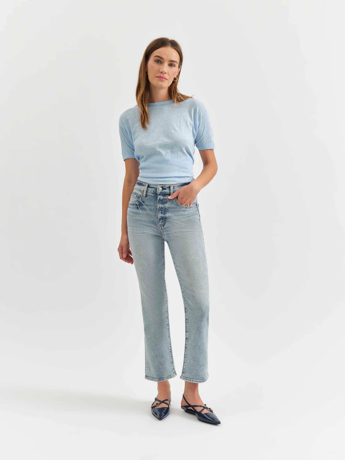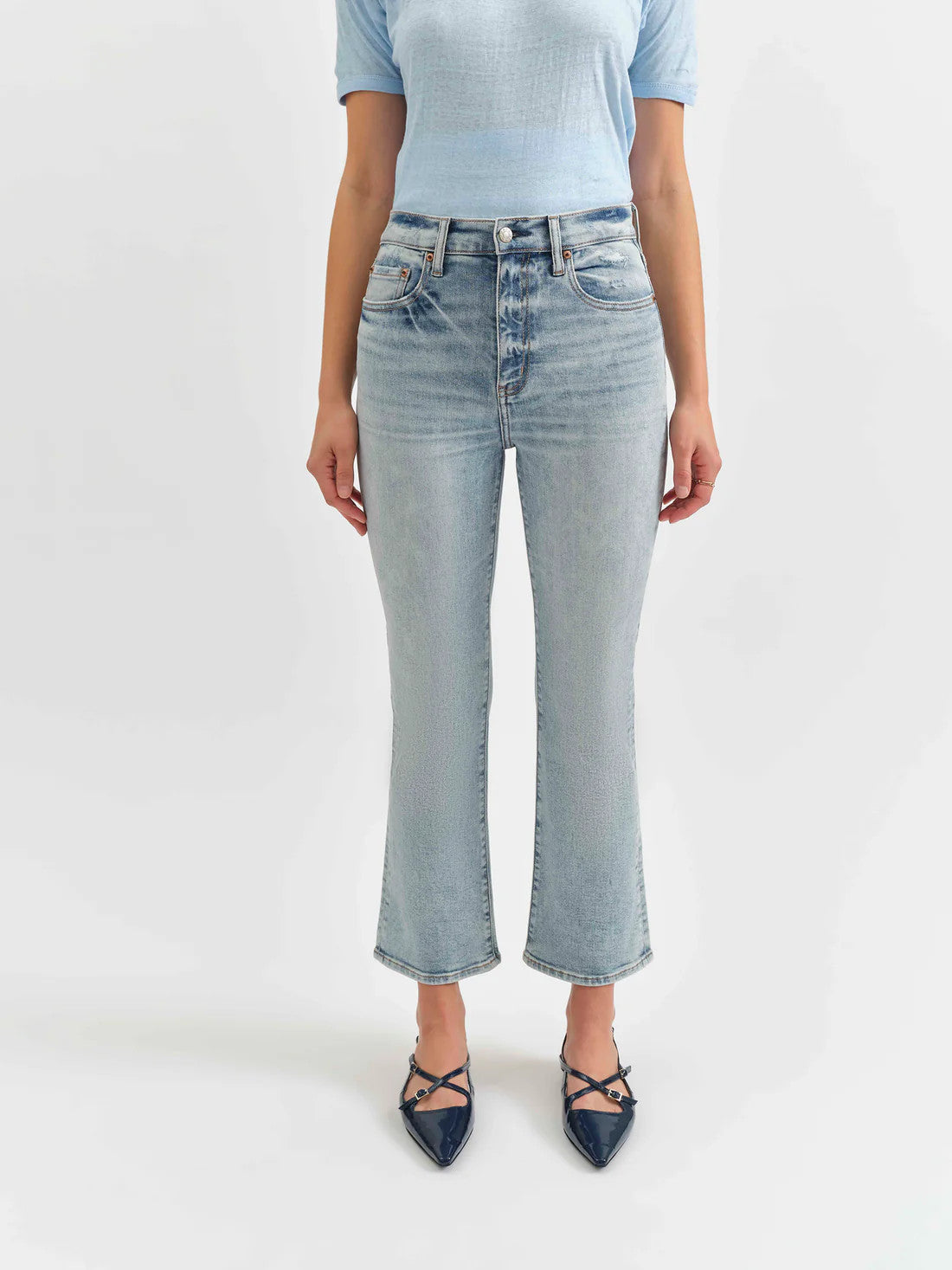 Soft high rise kick flare denim with a little stretch, perfect cut for petite (shorter) bodies.
