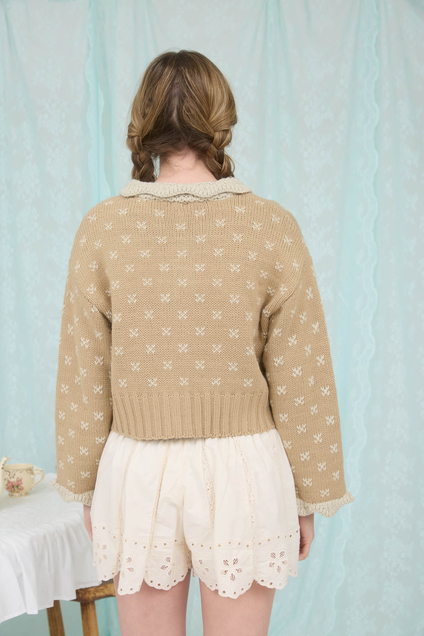 Softly nostalgic with a handmade feel. This cardigan brings vintage sweetness with its delicate knit pattern, scalloped collar, and gentle, earthy tones.