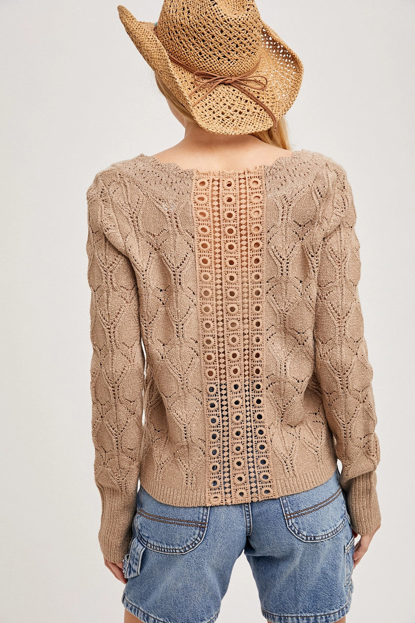 Soft, feminine, and beautifully textured. This lightweight knit top has an intricate openwork pattern and a gently scooped neckline that feels flattering and easy to wear. Fitted without feeling tight, it pairs effortlessly with denim, skirts, or layered under jackets.