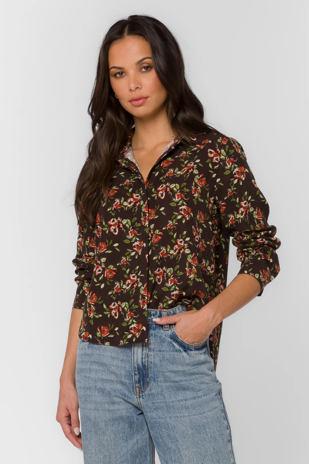 A timeless floral blouse with a modern twist, featuring a soft drape and button-front design. The dark base highlights watercolor-style blossoms in warm tones, creating a flattering, feminine look.