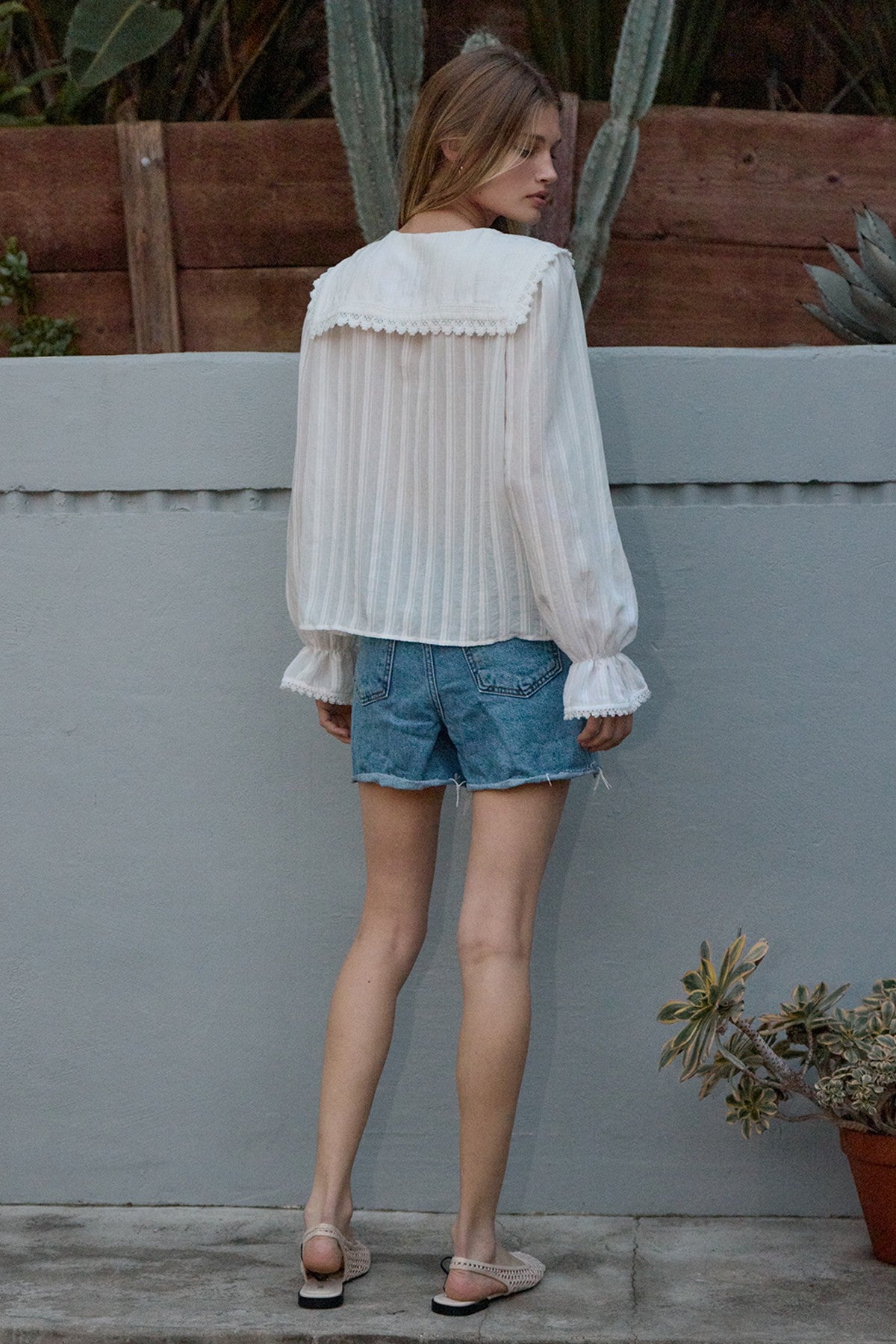 A soft, romantic blouse with vintage charm. Vertical textured stripes, a delicate lace-trimmed collar, and covered buttons give it a timeless feel, while the airy fabric and gently gathered sleeves keep the look light and feminine.