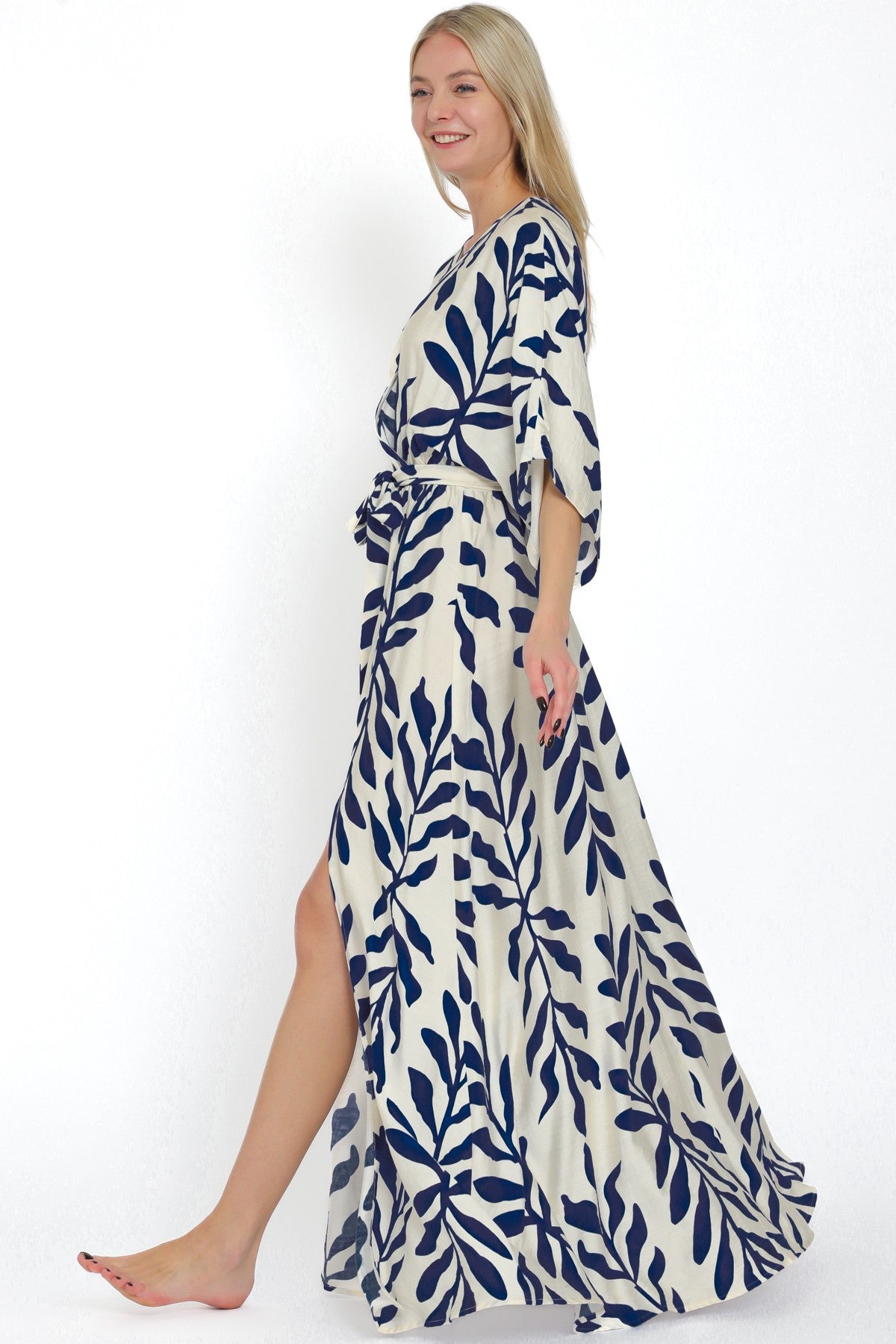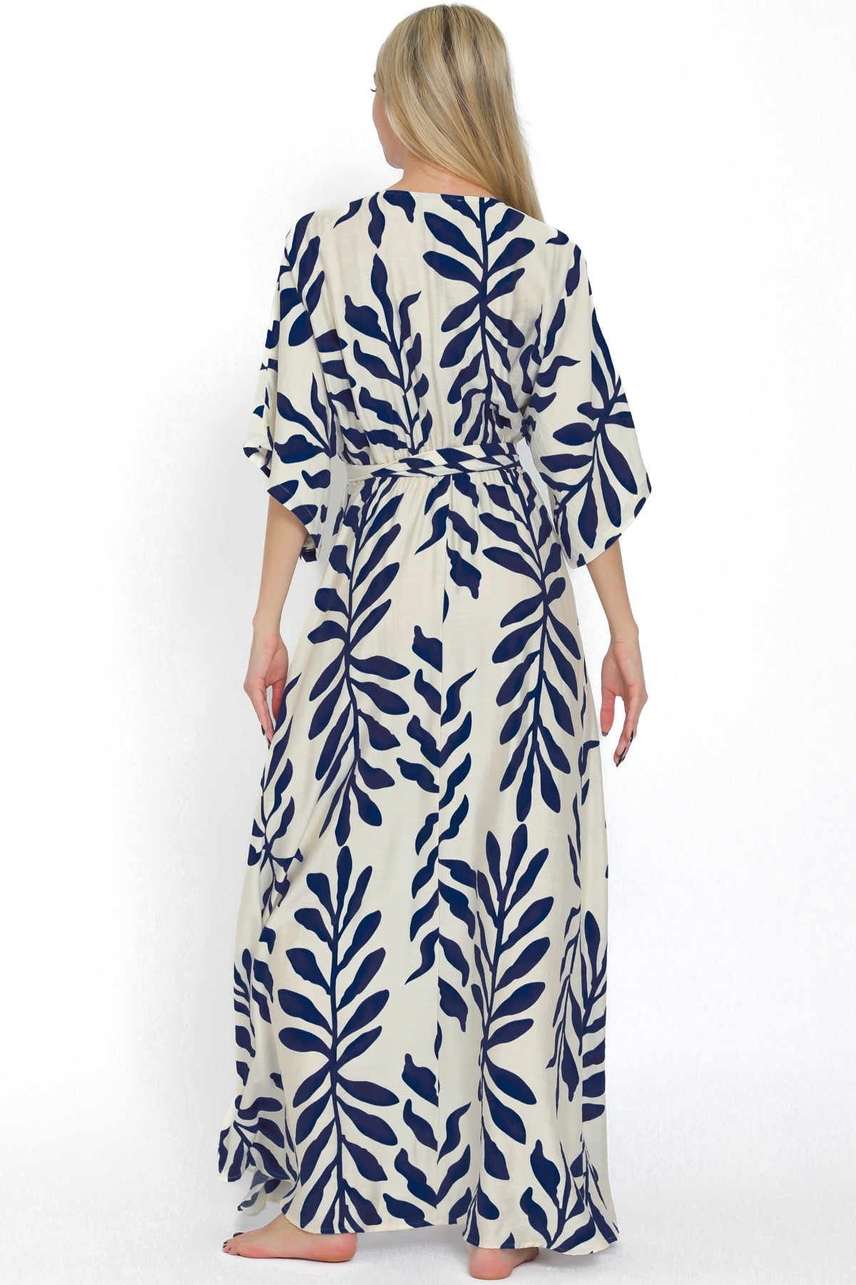 A flowing maxi cover-up with a bold botanical print, dramatic sleeves, and a waist-defining tie. The plunging neckline and front slit give it an easy, striking feel. Perfect for poolside lounging, resort days, and sunset cocktails. One of our best-selling maxi dresses for good reason. Comfortable, flattering, and easy to wear.