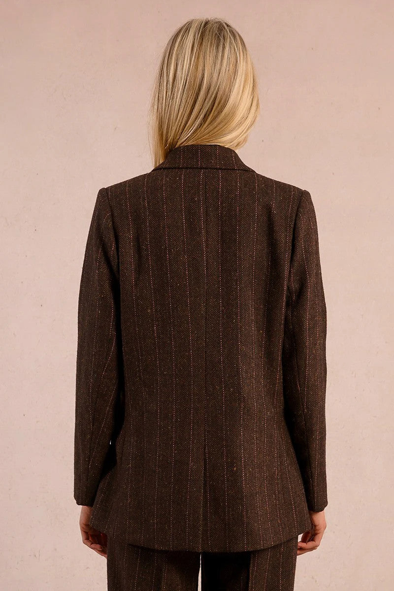 A refined layer with menswear inspiration, this double-breasted coat features subtle pinstripes and a relaxed, tailored fit. Structured lapels and long lines bring sophistication, while the versatile design makes it easy to dress up with trousers or down with sneakers. A timeless staple that blends polish with modern ease.