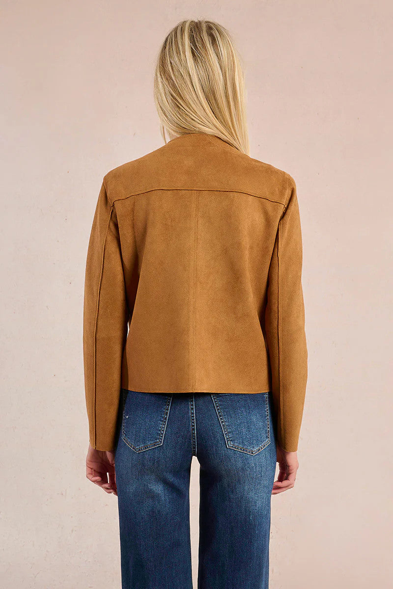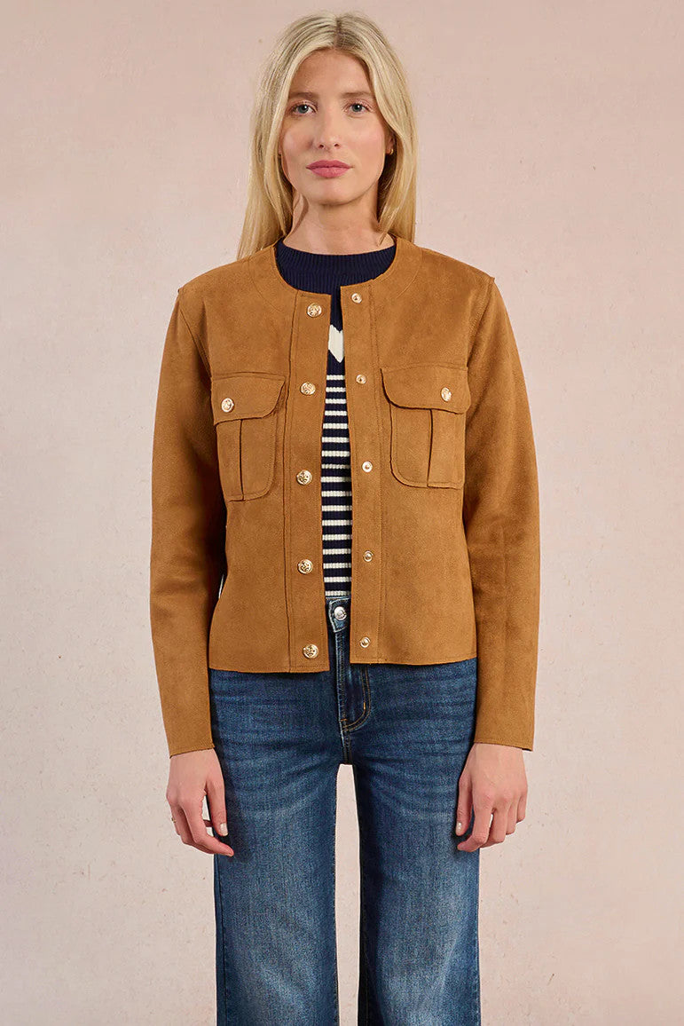 • Elevate your everyday style with this refined utility-inspired jacket, crafted in a soft suede-look fabric that adds instant sophistication. Designed with a clean, collarless neckline and two front flap pockets, it balances structure with understated elegance. Gold-tone buttons give it a polished finish, while the tailored cut sits perfectly at the hip for a flattering, modern silhouette