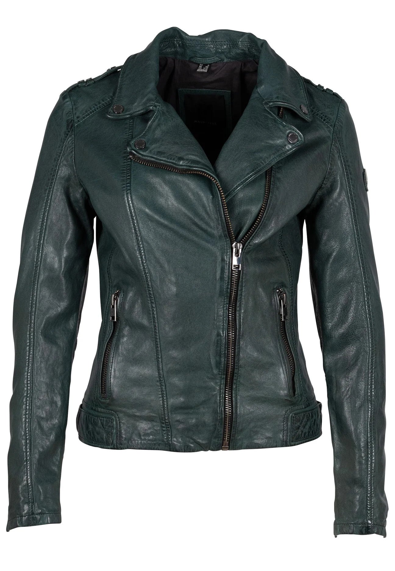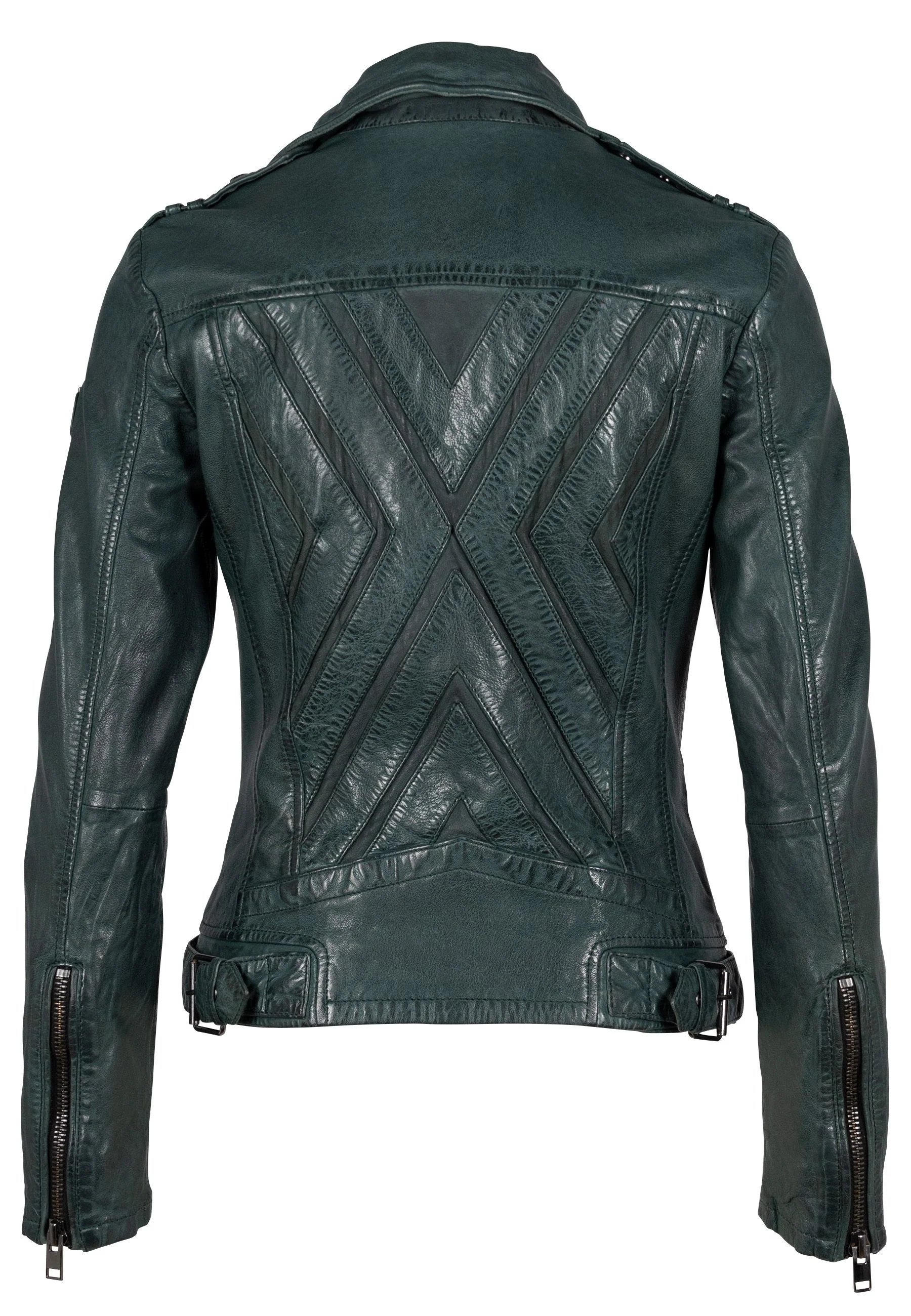 This classic moto jacket stands out with its bold green color and a unique embossed design on the back. Includes vertical zippered side pockets for easy storage. Be adventurous and make a statement!