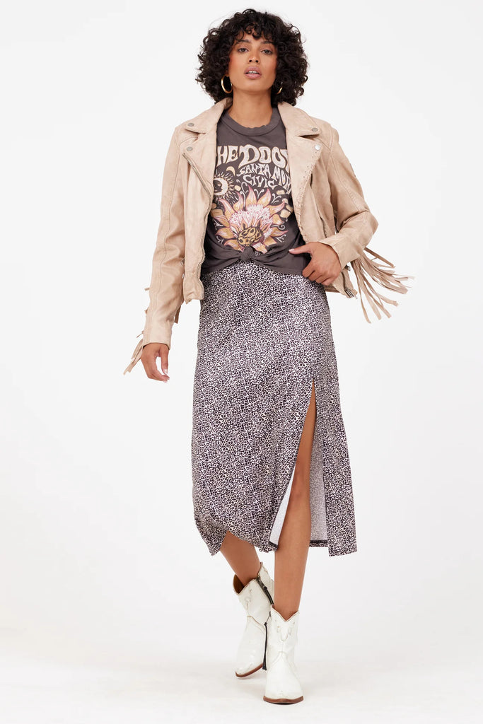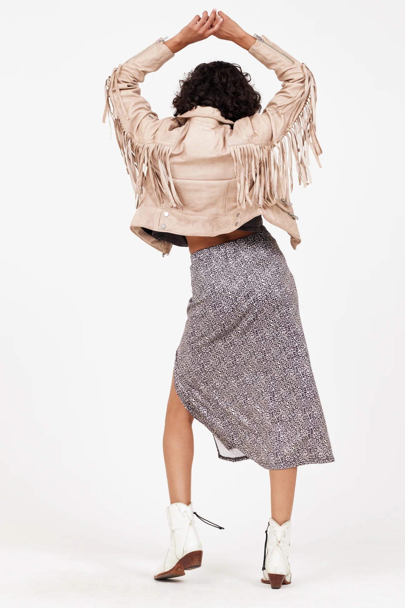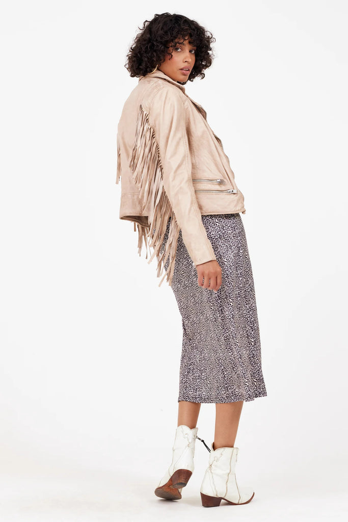 This jacket is a definite statement piece! Crafted from ultra-soft tumbled leather, it features fringe along the arms for fluid movement and whipstitch accents on the lapels for a refined touch. Considered a regular fit, offering a structured and flattering silhouette. Perfect for that upcoming music concert!